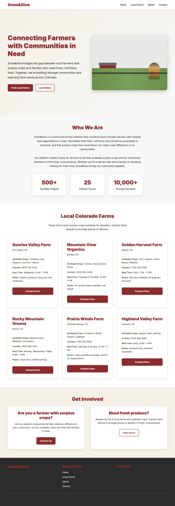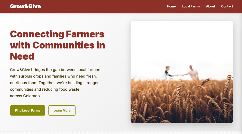 Create a website for local farmers to donate their unsold crops to those in need. Called “Grow&Give” and should follow this color palette, expressed in the attached image (above). Look at @https://www.farmers.gov/ and @https://farmland.org/ for references on the layout. The titles and headings should be bold sans serifs and heavyweight. The homepage should display a brief description of who we are with an image of a farm, and then list local farms in Colorado that want to give away their remaining crops.